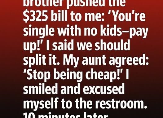 Dinner had started light and joyful — jokes flying, glasses clinking, laughter filling the restaurant. But when the $325 check arrived, the mood shifted. My brother slid it toward me with a grin. “You’re single with no kids — come on, cover it,” he said. My aunt added, “Stop being cheap!” and others laughed. I smiled politely, not because it was funny, but because I understood the moment clearly.