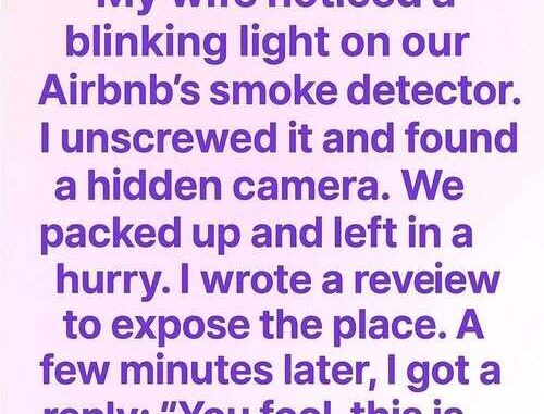 While staying at an Airbnb, a seemingly harmless blinking light on the smoke detector caught the attention of the narrator’s wife. Curious and concerned, he climbed up to inspect it — and what he found sent a wave of fear through him. Inside the device was what looked like a hidden camera lens.