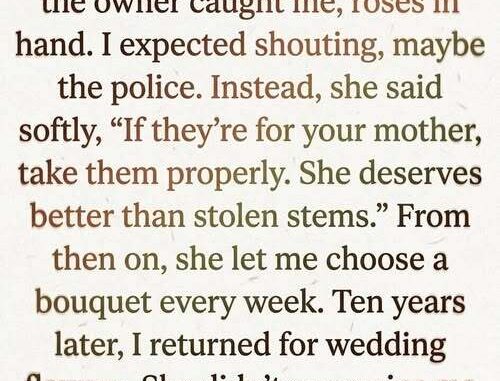 One afternoon, the shop owner caught me. I expected anger, but she only asked gently, “If those flowers are for someone special, they should be given properly.” I explained they were for my mother. She smiled and encouraged me to enter openly next time, offering kindness instead of punishment.