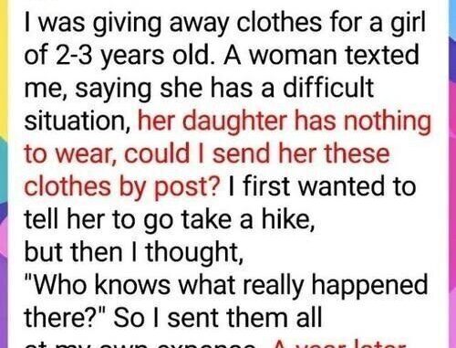 Nearly a year later, a surprise package arrived at my door. Inside was a heartfelt letter and photos of a little girl joyfully wearing the very clothes I had sent. The mother expressed deep gratitude, sharing how much that gesture had meant during a painful chapter in her life.