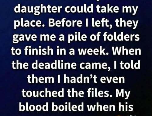 When Friday arrived, he returned to the office with the folders still untouched. Calmly, he explained to his manager that he had not finished the reports and believed the new employee should take responsibility for them. To his surprise, the manager’s daughter stepped forward and said she had already completed the work herself.